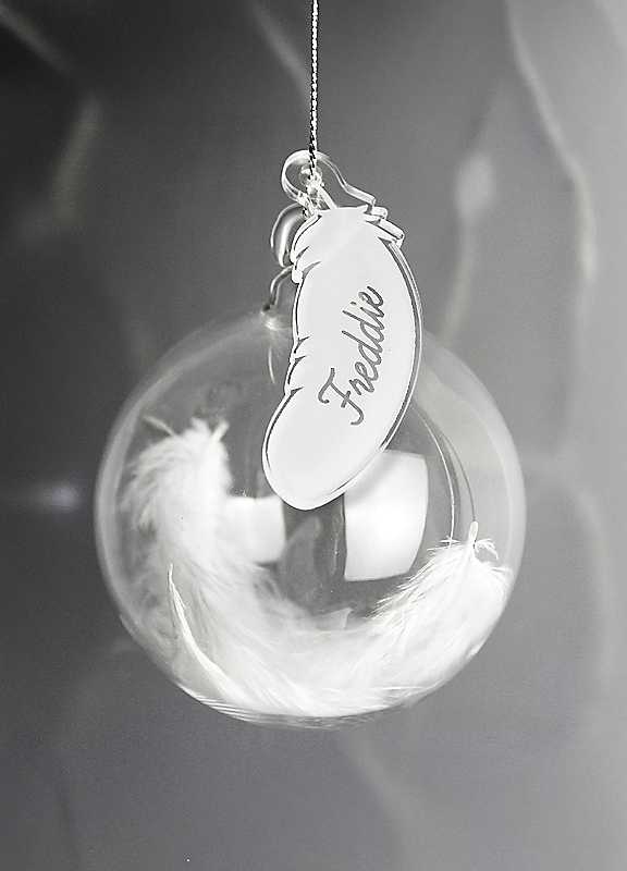 This Personalised White Feather Glass Bauble with Feather Tag will make a stunning addition to the Christmas tree. The Acrylic feather tag can be personalised with a name of up to 12 characters.Please avoid entering the name in block capitals, as this may result in it being difficult to read. Each glass bauble is filled with a delicate white feather, which will look great hung on any Christmas tree! Please note these are handmade so there may be some slight imperfections such as small water marks due to the manufacturing process.Brand: Personalised MomentoName - 12 CharacterPlease ensure that the clear protective film has been removed from the acrylic prior to use.