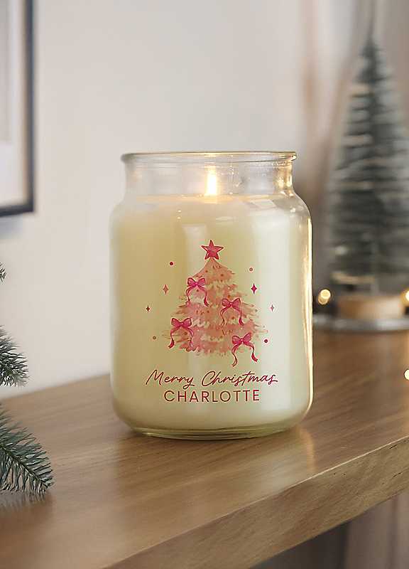 Add a touch of festive charm with this beautiful Personalised Pink Christmas Tree Large Candle.Perfect for gifting or decorating your home, this candle features a delicate pink design adorned with festive bows and a charming Christmas tree motif.Personalise this candle jar with up 2 lines of text, each containing up to 20 characters.Please note. the text on line 1 is case sensitive and will appear as entered. Please refrain from using fixed uppercase as this could make the script font difficult to read.Line 2 will appear in fixed UPPERCASE.Burn time is approx. 110 hours.Made from paraffin wax.Perfect for any occasion.Message Line 1 - 20 CharactersMessage Line 2 - 20 Characters50% Glass, 50% Wax