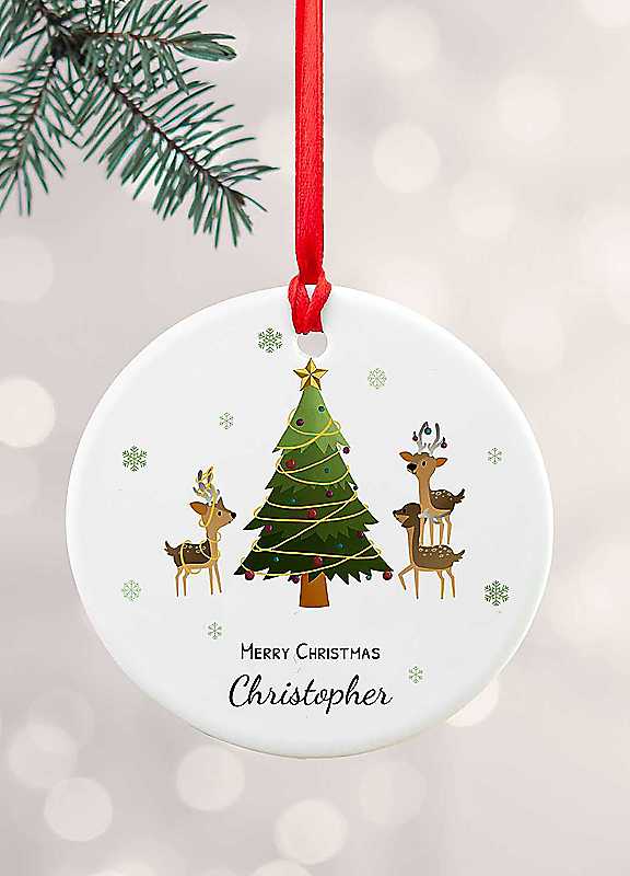 Perfect for a fireplace or to hang on a Christmas tree, our personalised round playing reindeers ornament will make a beautiful addition to any home this Christmas. Whether you are gifting this gorgeous decoration to a loved one or treating your own family to a new Christmas decoration, the beauty of this classy ornament is sure to delight.This ornament features a delightful design featuring three cute reindeers playing around a colourful Christmas tree. 'Merry Christmas' comes as standard text with your loved one's name written underneath in a black script font.Name: Up to 12 charactersDimensions approx. 7.5 x 7.5 x 0.3 cm | cute christmas ornaments, colorful christmas ornaments, round christmas ornaments, personalized christmas ornaments, reindeer christmas decorations, christmas tree ornaments