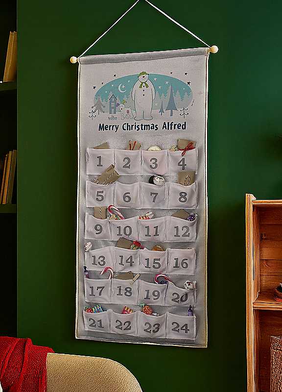 This Personalised The Snowman and the Snow dog Advent Calendar is the perfect way to count down to Christmas!The Advent Calendar can be personalised with a line of text up to 25 characters.Personalisation is case sensitive and will appear as entered.The advent calendar features 24 numbered pockets that can be used for small sweets or chocolates, allowing the recipient to count down from 1st December to Christmas Eve.Our advent calendars are ideal for use year on year and they make an eco-friendly alternative to traditional cardboard advent calendars.To reduce the risk posed by looped cords, cords should be kept out of the reach of children.The individual pockets are approximately (7.5cm x 6.5cm).The pockets all taper from the bottom to the top, the depth at the top is approximately 1.5cm.This item is not a toy, not suitable for under 36 months without adult supervision.Ideal for Christmas.Age Suitability: 6+Message Line 1 - 25 Characters100% Polyester