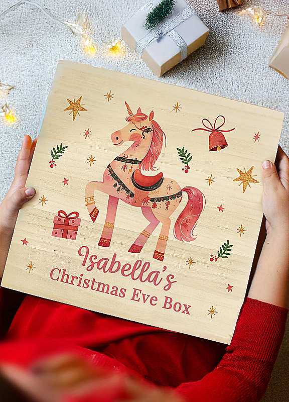 Make Christmas Eve extra magical with our Personalised Pink Unicorn Wooden Christmas Eve Box. Perfect for little ones who believe in the sparkle of Christmas, this charming keepsake box features a whimsical unicorn design in soft pink tones.Personalise with up to two lines of text, each containing up to 20 characters. The personalisation will be printed exactly as entered, so you can avoid using full capitals for a softer, more delicate look.Crafted from natural wood, each box may show slight variations in grain, knots and colour, giving it a one-of-a-kind character. It also includes a metal clasp and hinges for secure closure. It's perfect for holding small gifts such as books, DVDs, chocolate, pencils or other festive treats.Message Line 1 - 20 CharactersMessage Line 2 - 20 Characters100% WoodDimensions approx. 28H x 28W x 10.8D cm