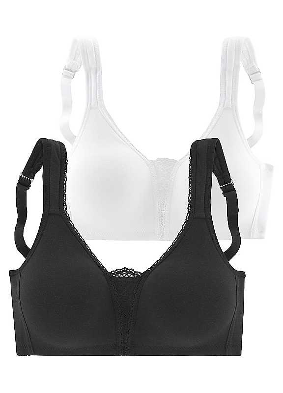 Practical, comfortable and stylish pack of 2 unwired bras, featuring seamless, preformed cups and wide, padded, adjustable straps for a perfect fit. The look is finished off by the beautiful lace insert at the mid front and adjustable back fastening, which offers you excellent day to day support. Brand: Petite Fleur Washable 90% Cotton, 5% Polyamide, 5% Elastane Please note: Do not tumble dry as the straps and rings could be damaged by the heat and break