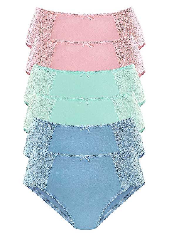 Pack of 6 midi briefs with lace inserts and small decorative bow at the front. Brand: Petite Fleur Smooth jersey fabric Washable 93% Cotton, 7% Elastane Lace: 95% Polyamide, 5% Elastane Pack 1: 2 x Blue, 2 x Pink, 2 x Mint Pack 2: 3 x Black & 3 x Blue Pack 3: 2 x Red, 2 x Black, 2 x White | women's briefs, ladies cotton briefs, soft ladies underwear, light weight underwear, underwear with bow, pack cotton underwear, polyamide underwear, feminine panties, light colour panties, lingerie briefs