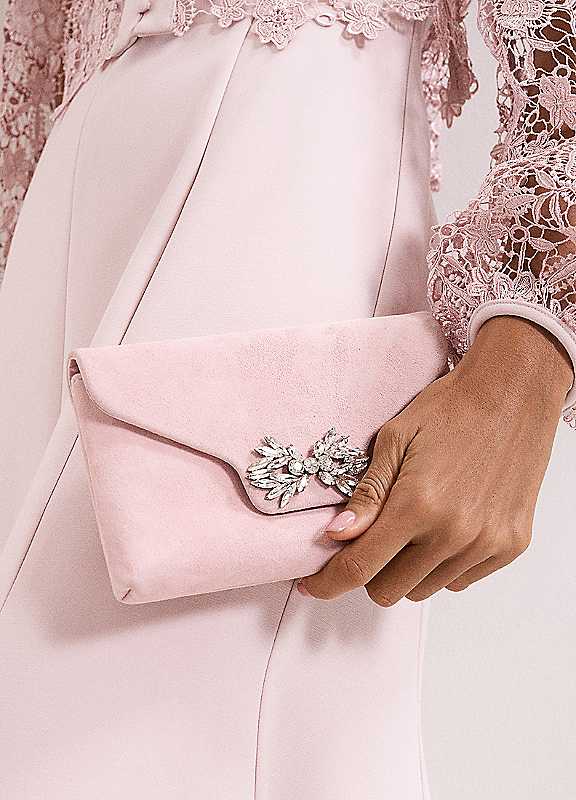 Made from 100% suede, this pale pink clutch bag is adorned with a beautiful, beaded embellishment that adds a touch of sparkle to your look.Do not wash100% Kid Suede