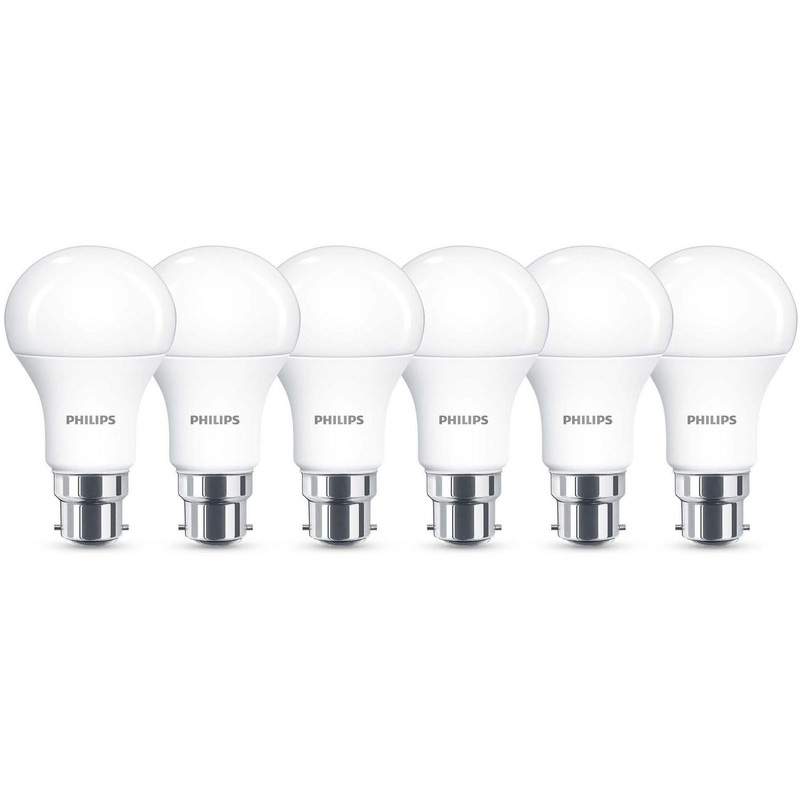 * 2700K Warm White Light * Frosted bulb - softer diffused light * Long lifespan - up to 15 years * Designed for comfort of your eyes * Perfect sustainable replacement for traditional standard incandescent bulbs Light up your world with these high-quality LED light bulbs from Philips. They provide a beautiful, warm white light and offer significant energy savings compared to traditional incandescent bulbs, making them the perfect sustainable replacement. These bulbs are designed for the comfort of your eyes, providing a gentle light that prevents the strain caused by glare or flicker. With an exceptionally long life of up to 15,000 hours, you can reduce the hassle of frequent bulb changes and enjoy a perfect lighting solution for over 15 years. * Warm white light – creates a comfortable and inviting ambience * Long lifespan – lasts for up to 15,000 hours * Energy-saving – the perfect sustainable replacement for traditional bulbs * Designed for eye comfort – reduces strain from glare and flicker * B22 bayonet cap – a standard fitting for many light fixtures | Philips A60 B22 LED Light Bulb GLS Frosted Warm 13W 1521lm (6 Pack) in White