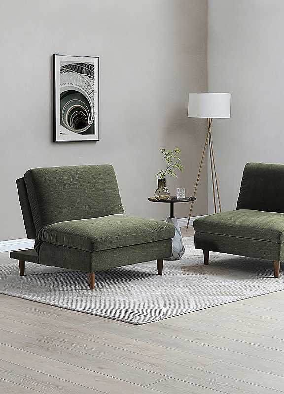 A modular click clack sofabed chair upholstered in a soft chenille fabric, finished with walnut wooden legs. This multi-tasking statement piece makes a great addition when you are short of space. Perfect for use in a variety of locations from a main living room, bedroom, or student accommodation. Weight of Product: 26kg Weight Capacity: 120kg Leg Height 15cm Seat dimensions 62 x 95cm Back Dimensions 39 x 95cm Floor to seat 47cm Specifications Material: Polyester, Wood Suggested Number of People for Assembly: 2 Self-Assembly Manufacturer's 1 year guarantee Product Care: Wipe clean only, avoid household cleaners/abrasives Overall Assembled Dimensions: H86 x W95 x D100cm