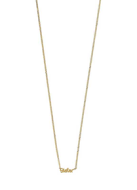 Reflect your love! Your new signature piece is a shoutout to one of the most important people in your life, your 'SISTER'. A sleek, gold-plated necklace with a discreet, small pendant in cursive script. A genderless piece, that can be worn by anyone, and a great gift idea for a loved one. Wear it solo or layer up for a personalised look. No matter how you choose to style the chain, which measures 38 cm + 9 cm extension chain, it's a must-have in your daily wear collection. And guess what - it's made from 99% material with care for our shared in mind. Reflect your love, every day, every way.Brand: PilgrimGold-plated necklace with SISTER pendant