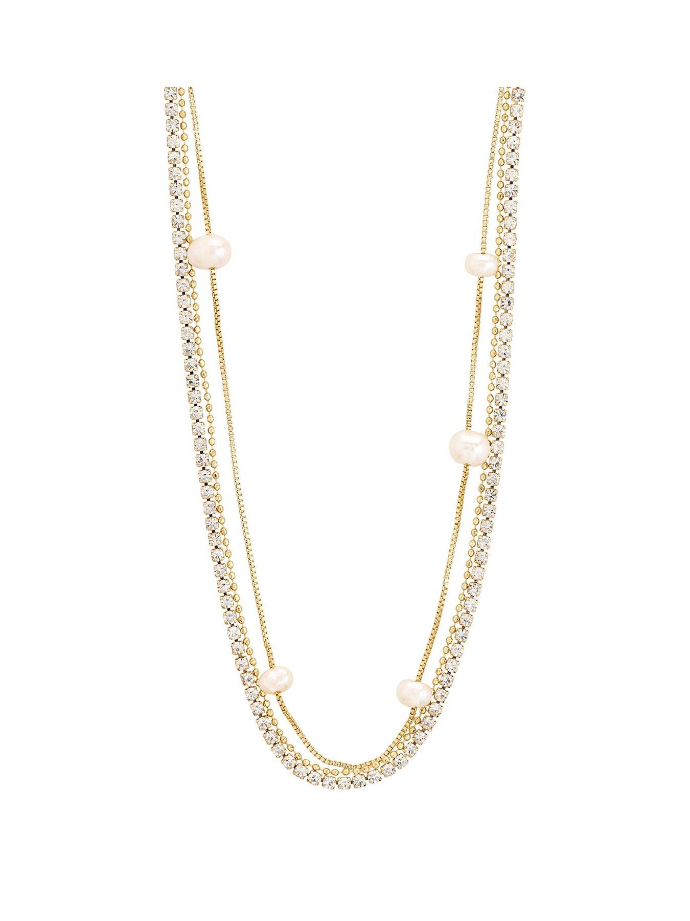Pilgrim STARLIGHT necklace 3-in-1 gold-plated Shine bright! Pilgrim's STARLIGHT 3-in-1 necklace is the perfect accessory to capture the summer's romantic vibe. A gold-plated piece that combines a slim box chain with genuine freshwater pearls, an elegant bead chain, and a crystal chain adorned with sparkling Preciosa crystals for a sweet layered effect. Pair it with a flowy summer dress or a simple tank top to create a dreamy look imbued with sweet summer vibes. The chain measures 38 cm + 9 cm extension chain. Depth: 6 MM Height: 470 MM Width: 6 MM Fashion Jewellery Type: Necklaces Metal Type: Base Metal Gold-plated 3-in-1 necklace With real freshwater pearls Measures 38 cm + 9 cm extension chain Sparkling Preciosa crystals Romantic layered look