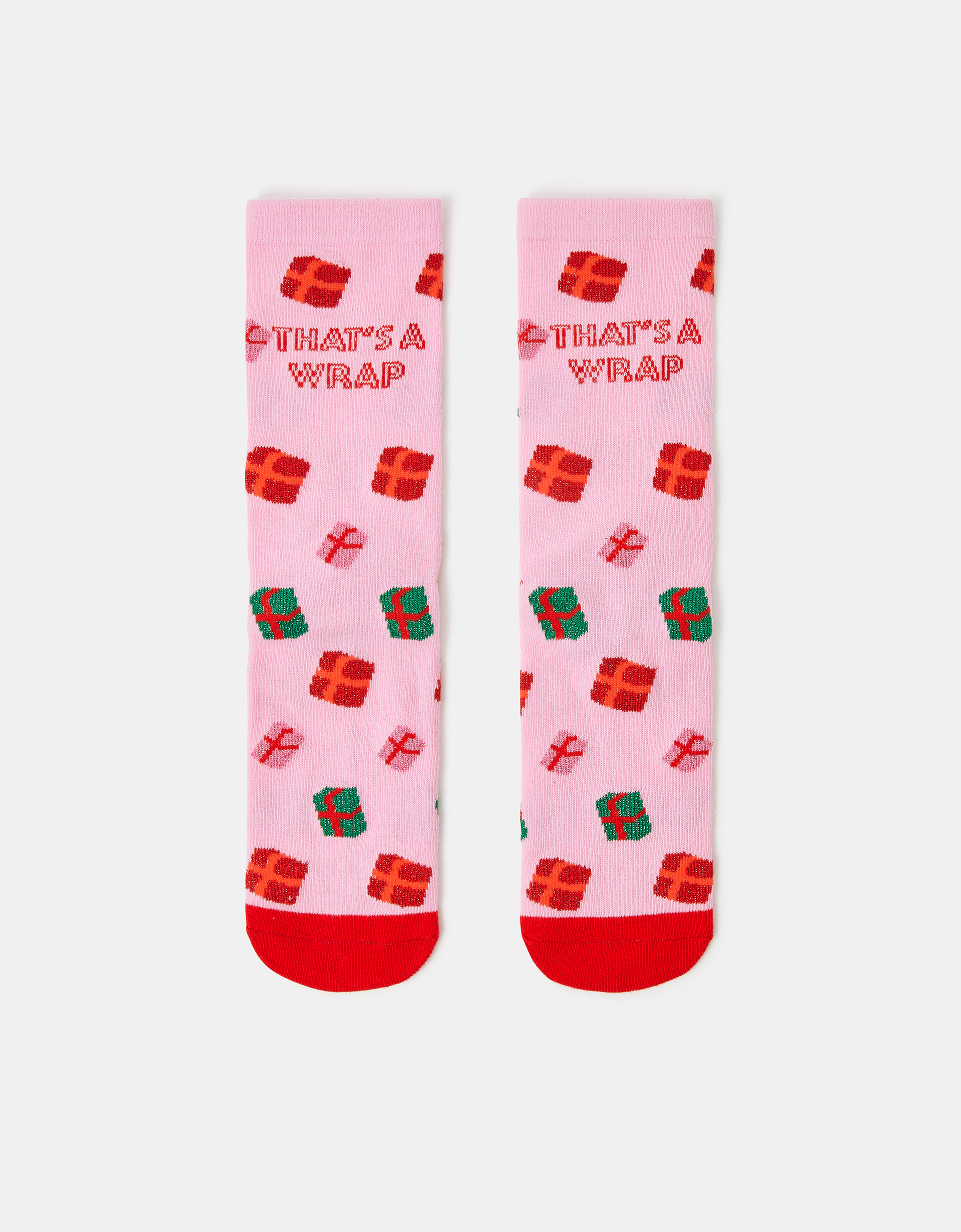 Made from a soft blend in bubblegum pink and festive red, these socks showcase a pattern of perfectly wrapped presents with 'That's A Wrap' below the top hem.