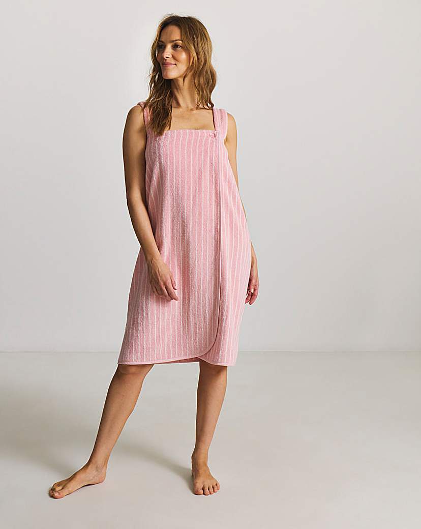 The perfect piece to throw on after a relaxing bath. Our towelling gowns are a firm favourite & guarantee to become a self-care must-have. Regular fit. Tie detail. Regular length. Length is 80cm/31 inches in the back and 83cm/32in in the front. Pink and white stripe. Matching Head wrap. Shop the rest of our gown range for more styles in a range of colours and fabrics to keep you cosy at home.