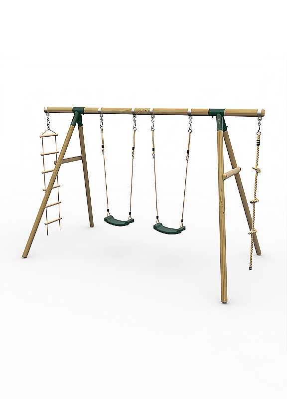 Kids will love this fantastic Plum® GibbonTM wooden swing set! Ideal for outdoor play and features double swings, soft feel climbing rope and cargo rope ladder. The round pole premium FSC® certified timber is pressure treated for extra strength. Metal swing attachments encircle the pole so no drilling is required; maintaining the strength and integrity of the timber, whilst wooden cross braces giving the garden swing set extra stability. Brand: Plum Perfect size for playing & socialising with friends Made from premium FSC® certified, pressure-treated round pole timber Play set includes double swing, soft feel climbing rope & cargo rope ladder The swing set uses soft feel ropes & heavy duty blow moulded seats for extra strength The swing set frame has cross braces for extra stability Metal swing attachments encircle the pole so no drilling is required, maintaining the strength & integrity of the timber 5-year manufacturer's warranty against wood rot & insect damage plus 12 months on other components Supplied flat-packed with easy assembly instructions All hardware supplied for installation including ground anchors for concreting into the ground Please allow a 2m safety perimeter Adult supervision is required at all times Suitable for outdoor Domestic use only Age suitability: 3 years+ FSC Timber wood Assembled size approx. 330L x 220W x 220H cm