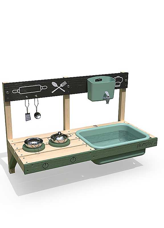 Unleash your little one's creativity with the Plum® Splash & Mash XL Mud Pie Kitchen.Designed to be securely attached to a fence, wall, playhouse, or any suitable flat surface, children aged 3 and up can explore hobbies and curiosities while developing vital early childhood skills.Encouraging creativity, motor skills, and a connection with nature, the Plum® Splash & Mash XL Mud Pie Kitchen lets kids enjoy hands-on roleplay right in your garden. Little explorers can discover wildlife, insects, and natural ingredients to use in their Splash & Mash Kitchen, creating magical recipes from mud, leaves, and pinecones - and memories that will last a lifetime. Equipped with a chalkboard for writing menus, recipes, or imaginative drawings, along with a set of pots, pans, and utensils, this mud pie kitchen invites hours of immersive outdoor play. Children can mix, stir, scoop, and serve their muddy creations, supporting role play, creativity, and fine motor skill development.The built-in water dispenser features a functioning tap and sink, adding a realistic touch to outdoor cooking adventures. Perfect for washing ingredients, filling containers, and cleaning up, it encourages water play while helping children build practical life skills. A charming wooden hob with printed dials sparks imaginative cooking scenarios, giving kids the feel of a real kitchen outdoors. Children can 'control' the heat, simmer their mud pies, and bring their culinary creations to life through storytelling and pretend play. Crafted from FSC® certified timber, the Plum® Splash & Mash XL Mud Pie Kitchen is made with responsibly sourced materials and built for outdoor durability. Its versatile attachment design allows it to be easily mounted to walls, fences, playhouses, and other suitable surfaces, making it a perfect space-saving addition to any garden.Pots, Pans & Utensils setPlastic water dispenser with working tap and sinkChalk board featureWooden hob & printed dial graphicsFSC certified timberIdeal for mounting to a fence, wall or suitable flat surface3 years+