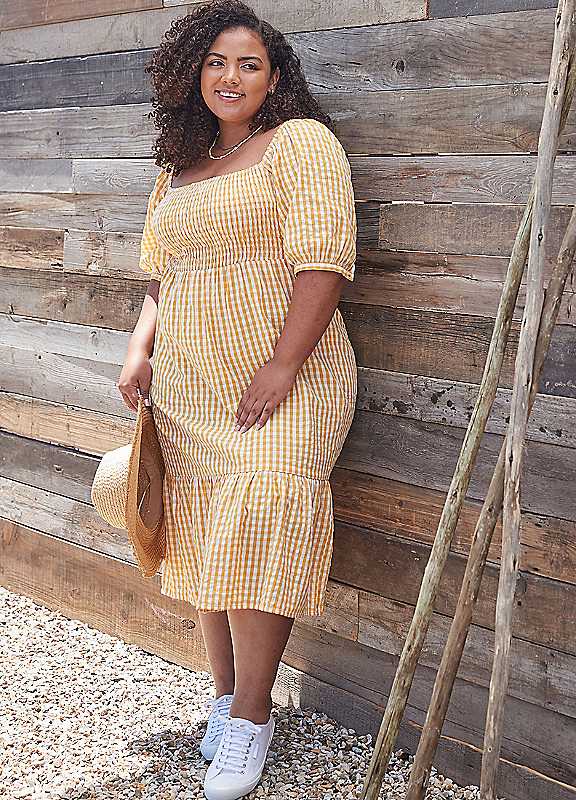 Indie is the perfect Summer piece! Uplifting yellow gingham print crafted in soft cotton. Flattering shirred bodice, square neckline and tiered skirt.Brand: FreestyleTiered midi lengthSquare necklineShirred bodiceSoft seersucker cottonSweet yellow gingham printMachine Washable100% CottonLength approx. 116 cm (45 in)
