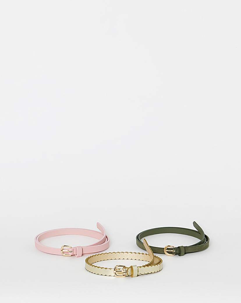 Refresh your accessories collection with this chic 3 pack belt set, offering three stylish options to elevate any outfit. Featuring a sleek olive belt, a soft dusty pink belt, and a textured gold scallop belt, this versatile trio brings a mix of colour, texture, and shine to your wardrobe. Each piece is finished with a matching gold tone buckle for a cohesive, polished look.