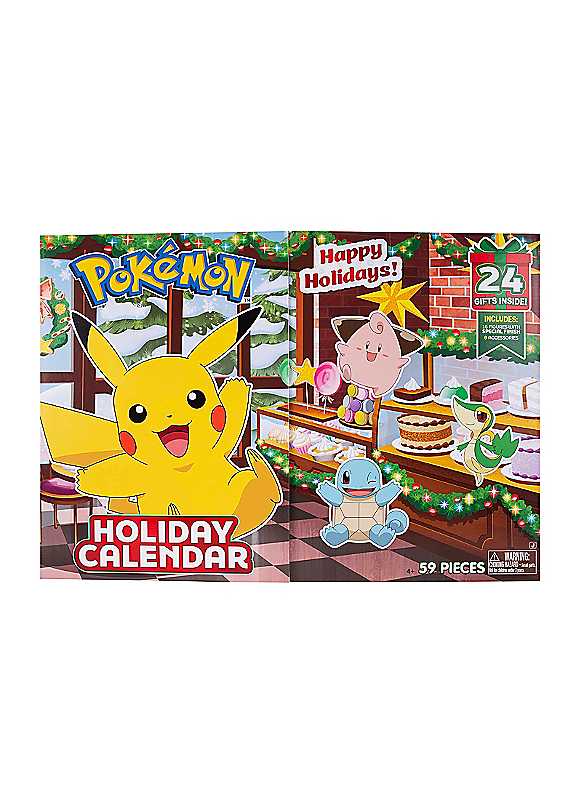 Celebrate the festive season with the Pok©mon Holiday Calendar. Featuring 16 Battle Figures plus eight accessories, this 24-day calendar holds a holiday-themed Pok©mon present for each day. All Battle Figures have a special finish. Play with a new figure or accessory each day and display the entire set at year's end.Officially licensed Pok©mon product from Jazwares. Ages 4+.Age suitability: 3 years+Choking Hazard - Not suitable for children under 3 years of age.