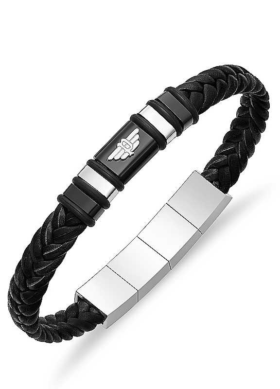 Rebellious in its simplicity, the Wavebreaker bracelet combines neatly braided black leather with the black wing logo plaque, adding an urban edge to any outfit. The P logo on the closure makes it unmistakably Police - bold and iconic.Black leather weaved braceletSilver plaque with wing logo | braided black bracelet, silver plate bracelet, bracelet black metal, stainless steel bracelet, black leather bracelet, mens casual bracelets