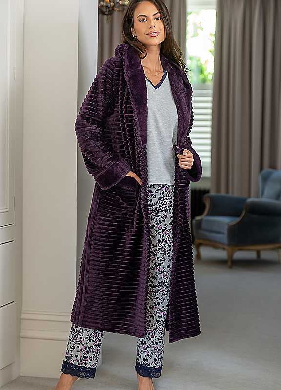 Pour Moi Cosy Ribbed Fleece Midi Hooded Dressing Gown - Plum - Size 12/14