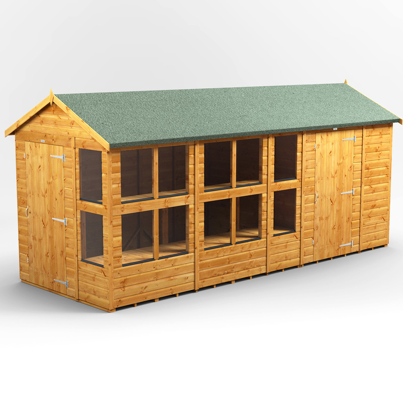 * Responsibly sourced timber * 12mm shiplap T&G cladding * Galvanised rust resistant metalwork * High performance polyester roof felt * Two-Tier staging included * Components for Garden Building, Premium Felt, Fixing Kit (including nails, screws, handle and turn buttons & a set of instructions) Designed for easy self-assembly, the 16x6 Power Apex Potting Shed Combi can be installed how you want by allowing you to place the door and windows in any position. This is a premium quality shed with high grade timber sourced from the finest Scandinavian forests. It is tongue and groove throughout giving you a garden shed which will last for many years. | Powersheds Power Apex Potting Shed Combi including 6ft Side Store 16' x 6' in Natural Timber