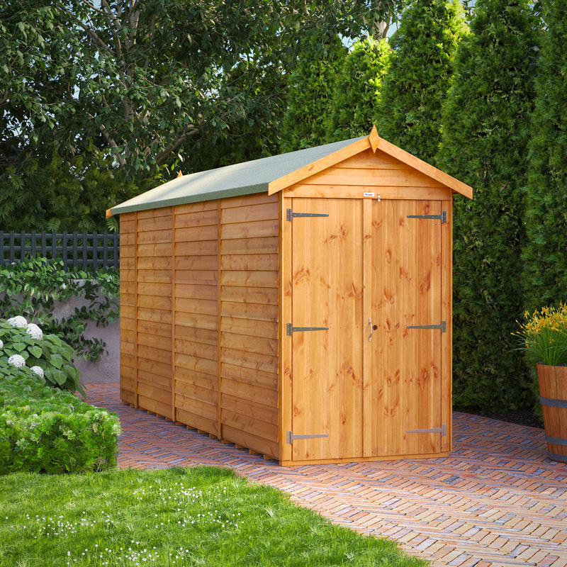 * Responsibly sourced timber * 10mm rustic overlap cladding * Galvanised rust resistant metalwork * High performance polyester roof felt * Advanced wood preservative * Includes: Components for Garden Shed, Premium Felt, Fixing Kit (including nails, screws, handle and turn buttons & a set of instructions | Powersheds Power Overlap Apex Shed 14' x 4' No Windows in Natural Timber