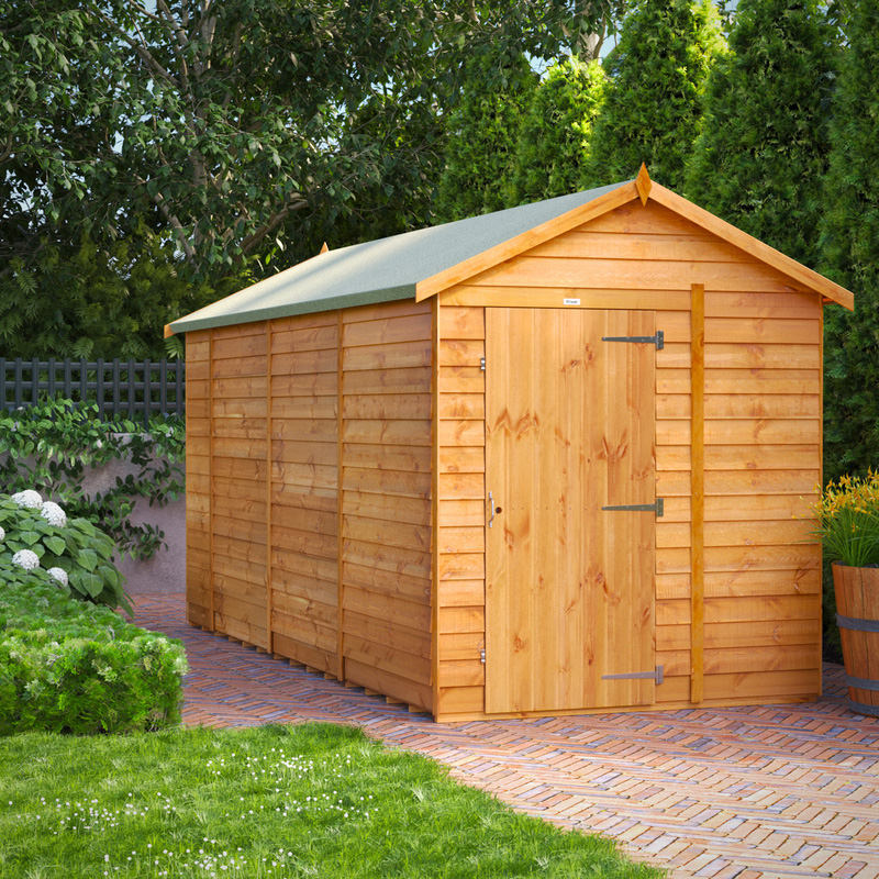 * Responsibly sourced timber * 10mm rustic overlap cladding * Galvanised rust resistant metalwork * High performance polyester roof felt * Advanced wood preservative * Includes: Components for Garden Shed, Premium Felt, Fixing Kit (including nails, screws, handle and turn buttons & a set of instructions | Powersheds Power Overlap Apex Shed 14' x 6' No Windows in Natural Timber