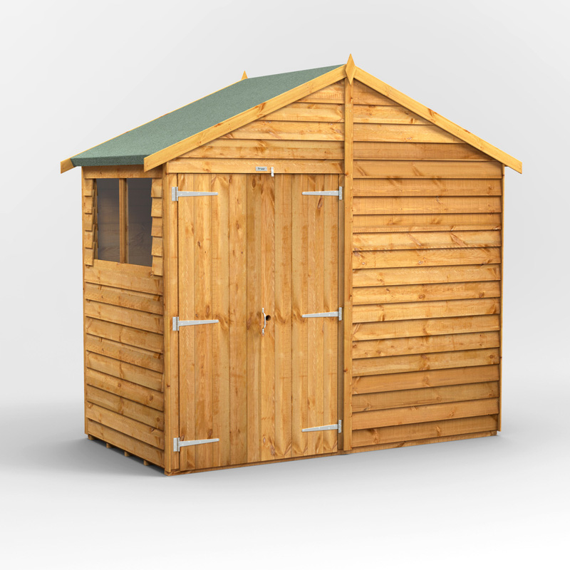 * Responsibly sourced timber * 10mm rustic overlap cladding * Galvanised rust resistant metalwork * High performance polyester roof felt * Advanced wood preservative * Components for Garden Shed, Premium Felt, Fixing Kit (including nails, screws, handle and turn buttons & a set of instructions) Designed for easy self-assembly, the 4x8 Power Overlap Apex, Double Doors Power Apex can be installed how you want by allowing you to place the door and windows (unless ordered windowless) in any position. The door can be placed in any position on any side, which you can choose as you're assembling the building. This is a premium quality shed with high grade timber sourced from the finest Scandinavian forests. It is tongue and groove throughout giving you a garden shed which will last for many years. | Powersheds Power Overlap Apex Shed 4' x 8' Double Doors in Natural Timber