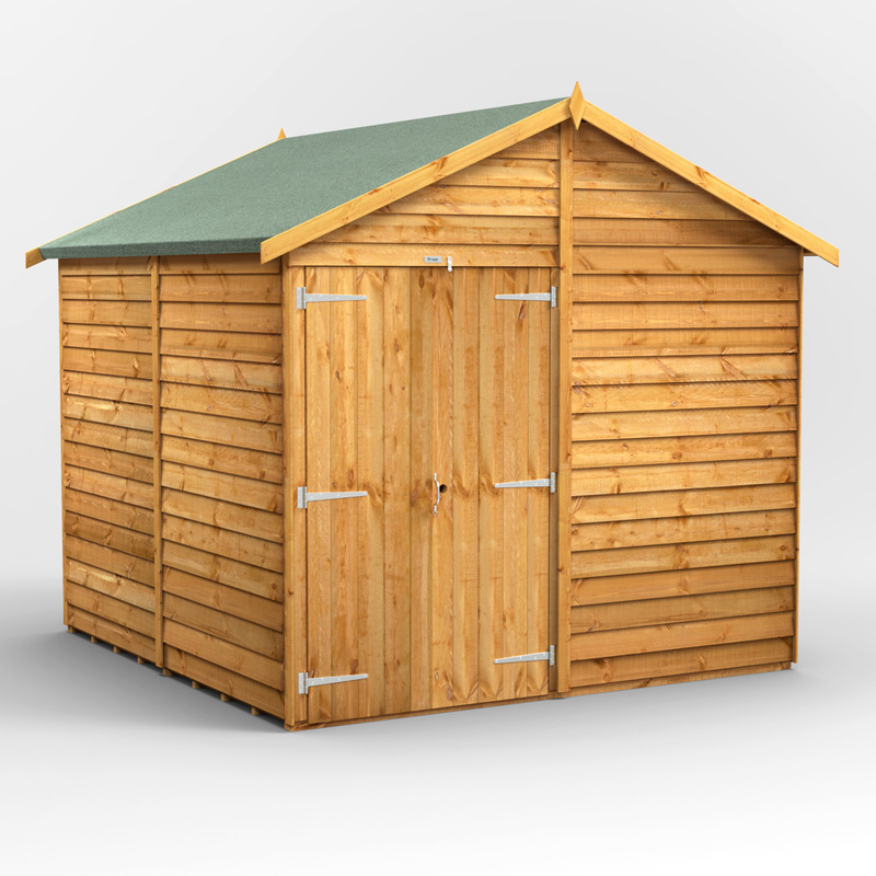 * Responsibly sourced timber * 10mm rustic overlap cladding * Galvanised rust resistant metalwork * High performance polyester roof felt * Advanced wood preservative * Components for Garden Shed, Premium Felt, Fixing Kit (including nails, screws, handle and turn buttons & a set of instructions) Designed for easy self-assembly, the 8x8 Power Overlap Apex, No Windows, Double Doors Power Apex can be installed how you want by allowing you to place the door and windows (unless ordered windowless) in any position. The door can be placed in any position on any side, which you can choose as you're assembling the building. This is a premium quality shed with high grade timber sourced from the finest Scandinavian forests. It is tongue and groove throughout giving you a garden shed which will last for many years. | Powersheds Power Overlap Apex Shed 8' x 8' No Windows in Natural Timber