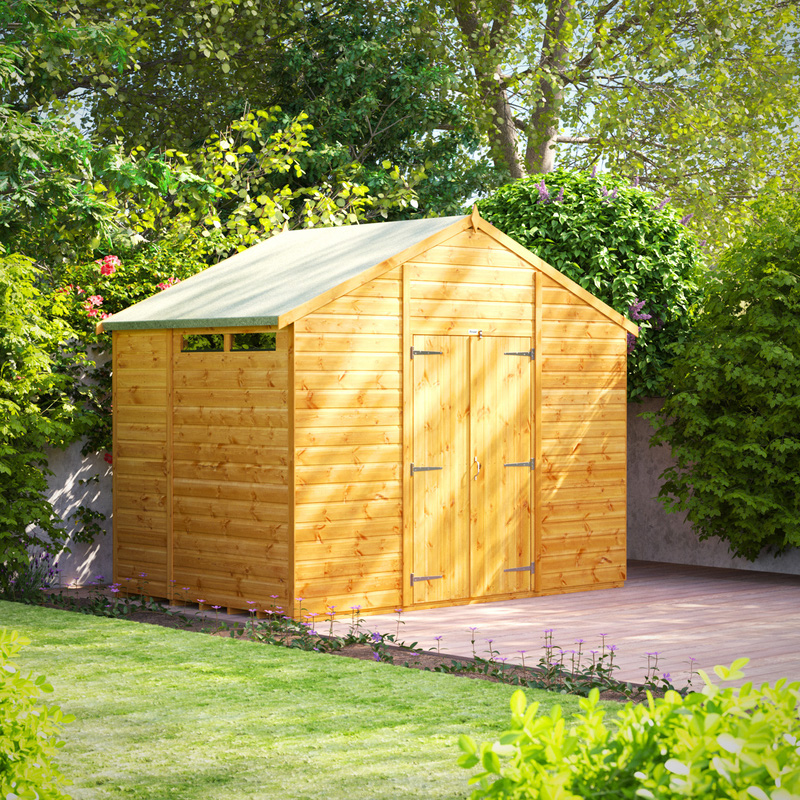 * Responsibly sourced timber * 12mm shiplap T&G cladding * Galvanised rust resistant metalwork * High performance polyester roof felt * Five-pin cylinder lock * Components for Garden Building, Premium Felt, Fixing Kit (including nails, screws, handle and turn buttons & a set of instructions) Designed for easy self-assembly, the 6x10 Power Security Apex, Double Doors Power Apex can be installed how you want by allowing you to place the door and windows (unless ordered windowless) in any position. The door can be placed in any position on any side, which you can choose as you're assembling the building. This is a premium quality shed with high grade timber sourced from the finest Scandinavian forests. It is tongue and groove throughout giving you a garden shed which will last for many years. | Powersheds Power Security Apex Shed 6' x 10' Double Doors in Natural Timber