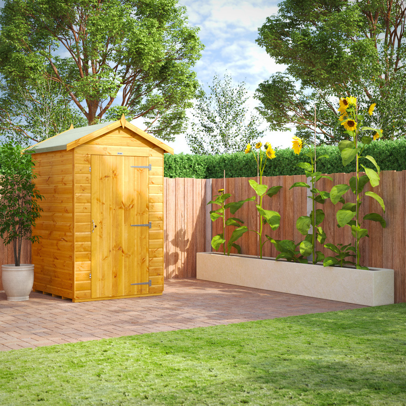 * Responsibly sourced timber * 12mm shiplap T&G cladding * Galvanised rust resistant metalwork * High performance polyester roof felt * Advanced wood preservative * Includes: Components for Garden Building, Premium Felt, Fixing Kit (including nails, screws, handle and turn buttons & a set of instructions Designed for easy self-assembly, the 4x4 Power Apex Windowless Garden Shed can be installed how you want by allowing you to place the door in any position while assembling the building. This is a premium quality shed with high grade timber sourced from the finest Scandinavian forests. It is tongue and groove throughout giving you a garden shed which will last for many years. | Powersheds Power Windowless Apex Shed 4' x 4 4' in Natural Timber