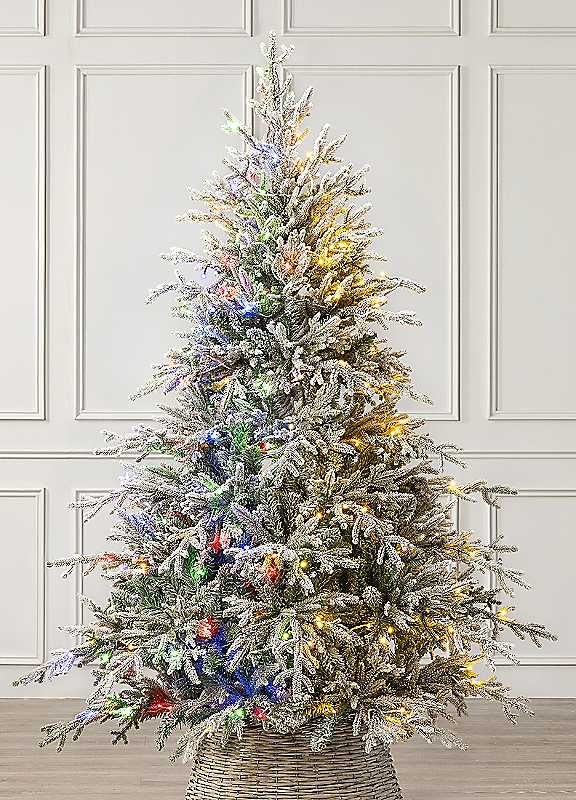 Create an elegant festive centrepiece with the Pre-Lit Flocked Verbier Fir Christmas Tree. This tree features a luxurious blend of lifelike PE and classic PVC tips for a natural look and feel. Snow-flocked branches evoke the charm of a frost-covered forest, while pre-wrapped LEDs ensure a fuss-free setup. Switch between warm white and multi-coloured lights, and cycle through multiple light effects to set the perfect Christmas mood. Each branch features a blend of PE and PVC tips, blanketed in snowy flocking for an enchanting winter forest look. PE tips add lifelike texture and shape, while PVC tips enhance the depth and fullness for a natural look and luxurious finish. Whether you prefer a cosy glow or vibrant pop of colour, the colour switch function gives you the power to choose. With a touch of a button, easily switch between warm white and multi-coloured LEDs to create the perfect ambience at Christmas. Bring your Christmas tree to life with a choice of dazzling light effects, including soft fades, twinkles, and dynamic colour changes. Whether you're after a soft, shimmery glow or a touch of festive sparkle, there's a lighting mode to suit every mood. Quick and easy to assemble, the tree features hinged branches for a fuller silhouette. Just pull them down, fluff them up, and decorate to your liking. Stronger and sturdier than bendy branches, they're ideal for hanging decorations aplenty. For flexible placement, the tree is mains powered with a 5m long cable and IP44-rated plug. A built-in timer lets you set it to light up automatically at your chosen time and switch off six hours later. You can also manually turn it on and off. Comes with a robust green metal stand for superior stability. Its dark green finish blends beautifully with the tree's foliage, while silver metal eyebolts secure it in place. Rubber feet offer added grip and protect hard floors from scratches. 6ft Tree: H180cm, Dia 125cm, 630 tips, 250 LEDs 7ft Tree: H210cm, Dia 140cm, 1218 tips, 380 LEDs 8ft Tree: H240cm, Dia 240cm, 1576 tips, 500 LEDs Blend of lifelike PE and classic PVC tips Colour switch: Warm White or Multi-Coloured Multiple light settings: Static, Fade, Twinkle & more Built-in timer function: 6hrs On/18hrs Off Mains powered: UK IP44 plug & 5m clear cable Green metal stand with eyebolts for easy attachment | realistic christmas tree, led christmas tree, pre lit christmas tree, flocked christmas tree, lighted christmas tree, fir christmas tree
