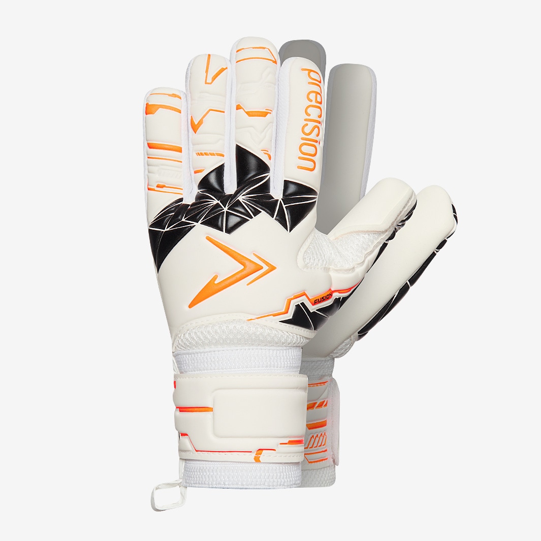 Excel in training and on matchday with Precision Junior Fusion X Negative Replica goalkeeper gloves in WhiteBlackFluo Orange, featuring a traditional design bolstered with modern technology for longlasting allround performance. Developed in partnership with pro keepers, the third generation of Precisions popular Fusion X series beats out the competition with a sleek, reengineered backhand. The Negative Replica edition features a 4mm NB White latex palm for great grip in all conditions and a negative cut for a snug fit. At the wrist, a more supportive closure keeps the gloves stable and secure, and theres a pull loop to help get them on and off. Negative cut Specially designed to provide total comfort while increasing your grip and feel for the ball. The stitching is inside the glove, leading to a much tighter and snug fit 4mm NB White latex Full traditional material backhand Coolair mesh underhand fabric to stop you sweating Comfortable fully elasticated wristband and pull loops with double touch fastener for extra support