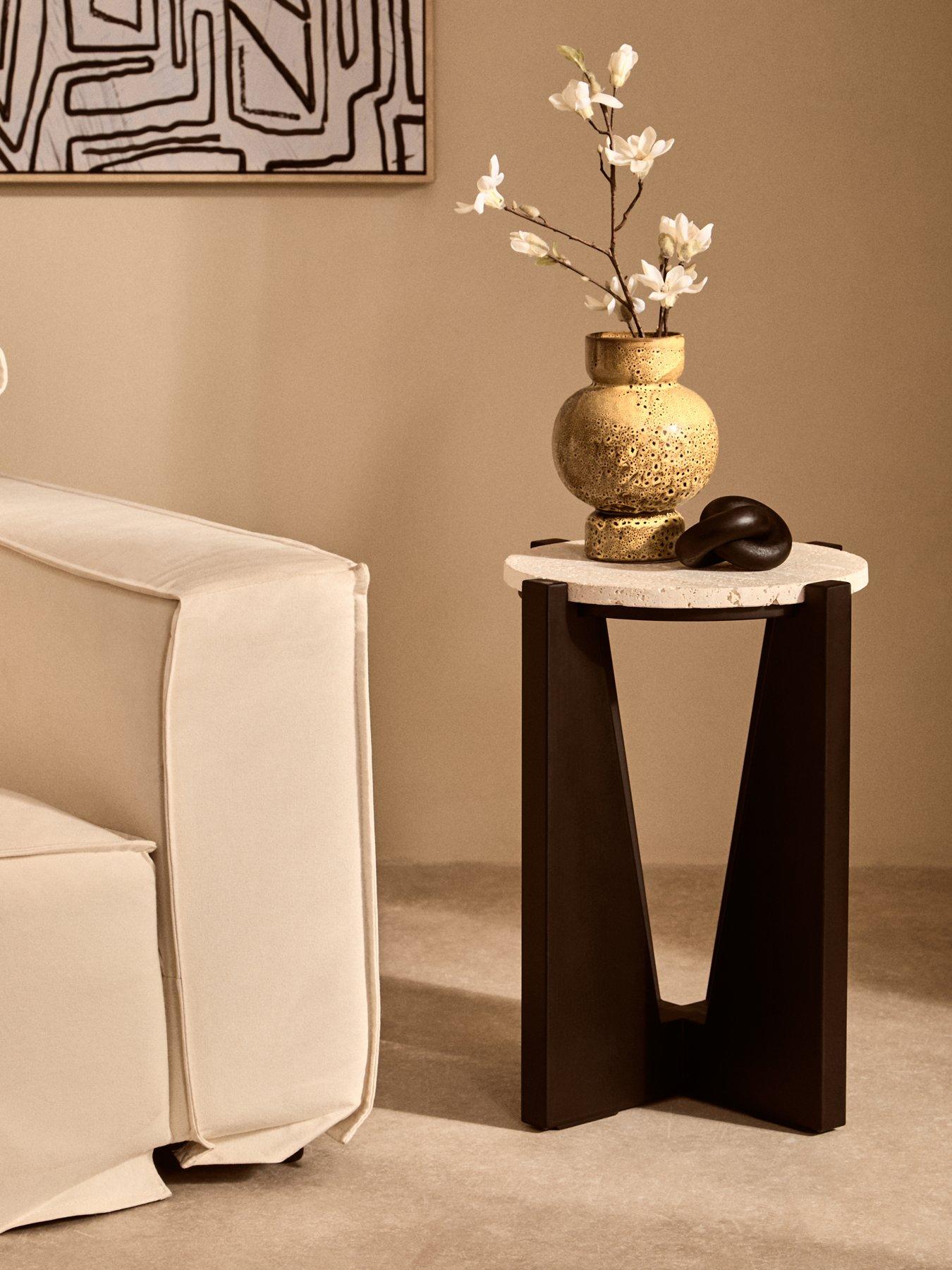 Premier Housewares Winton Travertine Side Table The Winton cream travertine top side table blends modern geometry with the elegance of natural materials. The travertine top, a natural limestone known for its fibrous texture and earthy, neutral tones, makes each table distinct. Supported by a rich black acacia wood frame, the angular base design adds a contemporary edge while ensuring stability and durability. Assembly: Ready Assembled Depth: 42 CM Height: 56 CM Material Content: Acacia Wood 25%,Veneered MDF 45%,Travertine 30% Width: 42 CM Polished travertine top Acacia wood frame Black finish Geometric base design Organic materials