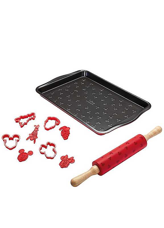 Inspired by Disney's Mickey & Friends, our magical new Prestige range of bakeware and accessories offers a delightful mix of functionality and fun for family baking. Featuring Mickey Mouse, Minnie Mouse, Donald Duck and more, whether you're making cookies, cakes or pastries our Mickey & Friends inspired range is designed to inspire and bring magic to your kitchen, achieving delicious results with ease.Brand: PrestigeBake with Mickey; Bake your own delicious Mickey Mouse cake! The prestige bake with Mickey set includes Non Stick Oven Tray 10 inch x 15 inch, Cookie Cutter Set of 4 and Silicone Rolling Pin 45cmBring a hint of magic to your home baking; As you stir and sprinkle, dollap and drizzle, you're doing more than just baking, you're making memories. There's magic in those stocky hands and that sprinkle of flour. And as the cake rises we can start to believe. Mickey logo silicone rolling pin; Avoid those sticky situations with the red silicone non stick rolling pin featuring a signature Mickey logo pattern. They feature smooth wooden handles and are 45cm in length.Characterised cookie cutters; The 4 piece cookie cutter set features 4 of your favourite Disney characters, Mickey, Minnie, Donald and Goofy. Each coming with a stamp so you can imprint a Mickey and friends character on each cookie.Non Stick oven tray; Made from heavy guage steel and with extra large handles, this 10 inch x15 inch baking tray can tackle any recipe.