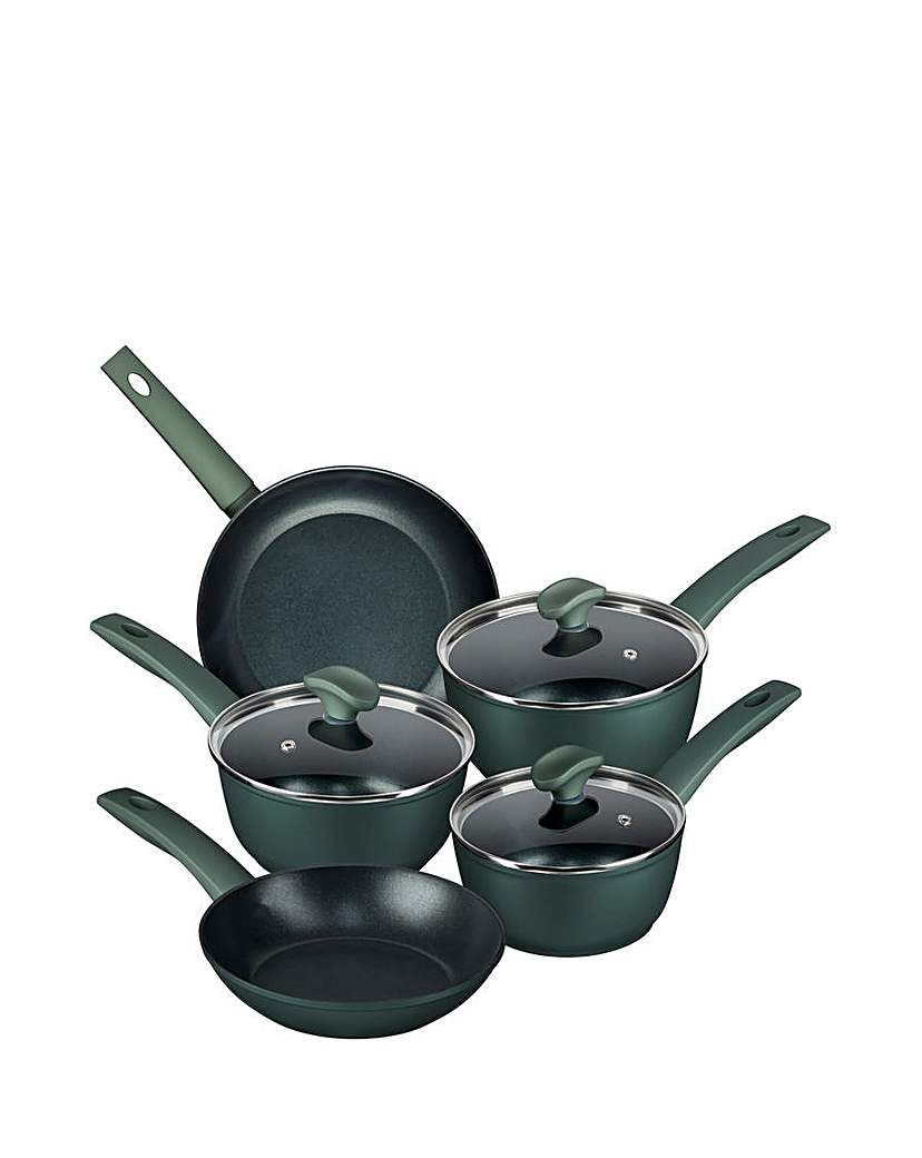 Earth Friendly 5-Piece Non-Stick Induction Pan Set. Cook with confidence and care. This essential 5-piece pan set combines everyday cooking performance with eco-conscious innovation. Crafted in Italy from 100% recycled and recyclable aluminium, each piece is designed to deliver fast, even heating on all hob types - including gas, electric, ceramic, and induction. The set features our exclusive Hydraloe plant-based non-stick coating, offering effortless food release and easy cleaning. Free from Pfoa and Pfas, it's a safe, toxin-free choice for your kitchen. Designed for versatility and durability: Saucepans are ideal for boiling, simmering, and reheating. Frying pans handle everything from searing to sauteing. All pieces feature a scratch-resistant interior, a durable dark green exterior, and soft-touch handles for a secure, comfortable grip. Oven safe up to 180 and dishwasher safe, this set is built for convenience and backed by a 5-Year Guarantee - so you can cook with peace of mind and a lighter environmental footprint. Set Includes: 16cm Non-Stick Saucepan + Glass Lid, 18cm Non-Stick Saucepan + Glass Lid, 20cm Non-Stick Saucepan + Glass Lid, 20cm Non-Stick Frying Pan, 28cm Non-Stick Frying Pan.