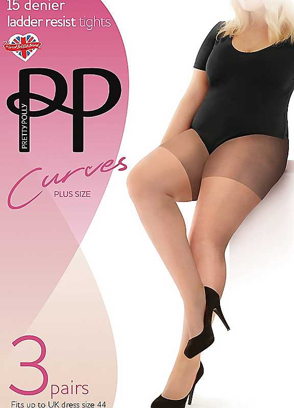 The Pretty Polly plus size range is specially designed to fit up to a 4 XL. These Curves Ladder Resist 3 pair pack of 15 denier plus size tights are designed for ladies with a more curvaceous figure to fit up to 60 ins (152 cm) hips, with an added back panel for comfort. They are a staple and perfect for everyday wear.15 denier sheer legSpecial panel for more comfort around bottom and hipsReinforced body and toe for extra durabilityHand wash only100% Nylon