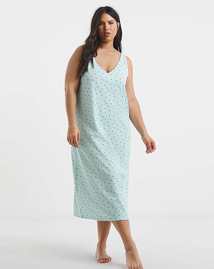 Relax in cotton blend comfort with our cosy/lightweight maxi/midi/t-shirt nightie. Easy regular fit. V-Neckline. Sleeveless. Blue spot design. Breathable Fabric. Length is 122-124cm/48in. All of our nighties are designed with fit in mind, for guaranteed comfort. Shop our value range online now, in multiple prints & colourways.