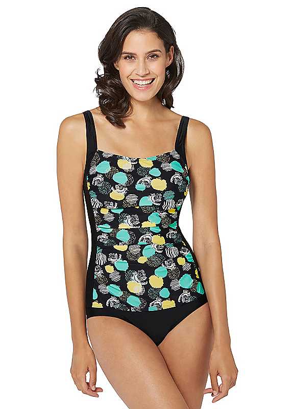 Lovely print swimsuit with ruched detailing at the front, with a straight cut back. Featuring adjustable straps, soft cups and half corsage. Regular straps Washable 80% Polyamide, 20% Elastane