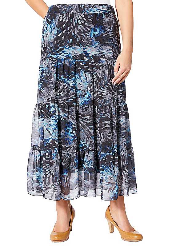 This skirt is so flattering! Styled in a slip-on design with fully elasticated waistband. The panel cut and layered finish gives it a wide, flattering shape. It's lined to take away the transparency but not the charm! Elasticated waist Washable 100% Polyester Petite length approx. 82 cm (32½ in) (size 16P) Regular length approx. 90 cm (36 in) (size 16)