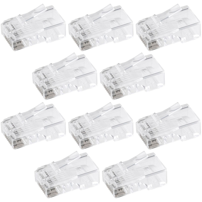 * CAT5e RJ45 * Push through connector * Easily verify the correct wiring order * Neat & professional finish * Gold plated Create custom-length cable installations with this set of 10 modular connectors. Designed for terminating CAT5e Ethernet cables, these connectors feature a push-through design that allows wires to be inserted easily, eliminating the need for stripping and crimping individual wires. Compatible with both solid and stranded cables, these connectors ensure a secure and reliable connection for high-speed data networking. The gold-plated serrated contacts provide enhanced conductivity, while the transparent housing allows you to easily verify the correct wiring order. * Push-through design – eliminates the need for stripping individual wires for faster installation * Gold-plated contacts – ensures enhanced conductivity and a professional finish * Transparent housing – allows for easy verification of wiring alignment * Versatile compatibility – works with both solid and stranded CAT5e cables * Pack of 10 – ideal for multiple custom-length cable installations | PROception CAT5e Modular Connectors RJ45 8P8C (10 Pack) in Clear