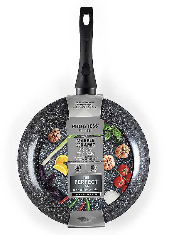Offering a perfect combination of practicality and style, this Progress Marble Ceramic 28 cm frying pan is ideal for cooking fresher and healthier meals using little or no oil. Crafted from durable pressed aluminium, this lightweight frying pan is great for cooking larger meals and features a non-stick cooking surface for easy cleaning. The metallic marble ceramic coating offers improved heat distribution and is PFAS-free to avoid releasing harmful chemicals into the environment.5 Year guarantee