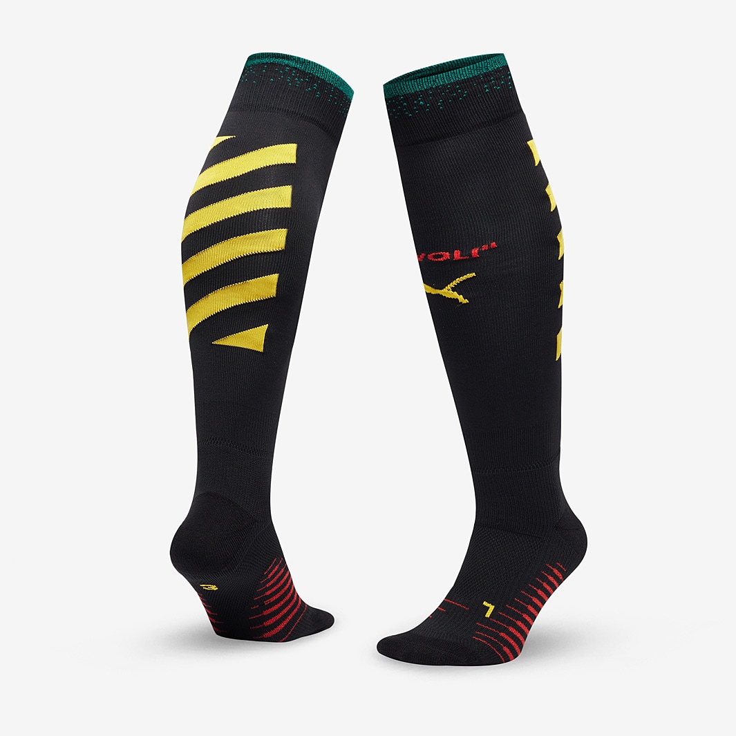 Elevate your look on the pitch and show your support for the Rossoneri with the PUMA AC Milan Graphic Sock x OffWhite in PUMA BlackPower Green. Part of a collaboration between streetwear icon OffWhite and seventime European champions AC Milan, the PUMA AC Milan x OffWhite socks display your passion for the Rossoneri in striking style. The smart PUMA Black base is enhanced with eyecatching utilitarianinspired contrast graphics and bold hues of red, gold and green to create a striking look that helps your skills stand out on the pitch. DIAVOLI Devils lettering nods to Herbert Kilpins founding message We will be a team of devils. Our colours will be red like fire and black like the fear we will invoke in our opponents. Supportive, flexible fabric combines with strategically placed padding at the ankle and toe to keep you comfortable while you sprint and slide across the turf. Crosscompression support at the ankle helps to minimise your chances of injury, and mesh panels in highheat areas promote airflow to keep you cool through tough training sessions. PUMA AC Milan x OffWhite 202425 fourth socks Part of the AC Milan x OffWhite 202425 collection Diavoli lettering Double layercomfort weld Ankle crosscompression support Padded toe and ankle Mesh ventilation panels