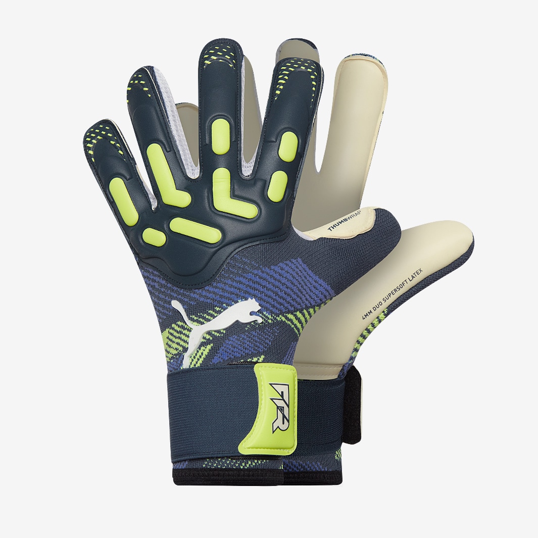 Claim victory for your team with PUMA Future Pro Hybrid goalkeeper gloves in Gray SkiesFizzy Apple, featuring a dualmaterial backhand for both agility and punching power. Combining rollfinger and negative cuts, the Future Pro Hybrid provides the perfect mix of catching potential and comfort. Its Supersoft latex palm with Duo coating is designed for durability, providing longlasting grip and impact absorption in wet and dry conditions. The dualmaterial backhand pairs a knitted underlayer with a latex upper section, ensuring a lightweight, breathable feel while adding extra distance to your punches. At the wrist, a removable elasticated strap allows you to personalise the fit. Future range endorsed by Ederson and Manuela Zinsberger Palm 4mm Duo Supersoft latex Cut Hybrid Rollfinger on outer fingers, negative on inner fingers and thumb BackhandBody Knitted backhand for enhanced fit and agility with NEW latex application to enhance grip and punching power Wrist Closure Elasticated, removable wrist strap for secure fit and wrist stability Thumbwrap extended latex palm for maximum catching area and comfort