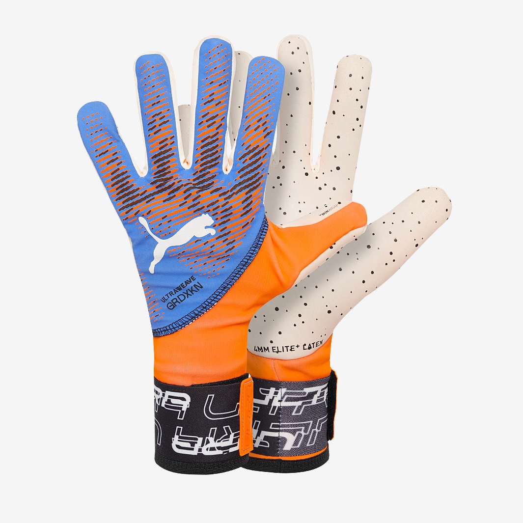 Show your matchwinning agility with PUMA Ultra Ultimate 1 NC goalkeeper gloves in Ultra OrangeBlue Glimmer, the first ever glove to feature superlight ULTRAWEAVE fabric. As used on PUMAs flagship football boots and kits, ULTRAWEAVE is a nextgen material thats extremely lightweight and stretchy but also very resilient.Its fourway stretch adapts to your hand shape as you clench to punch or extend to make saves, ensuring the best possible fit throughout every action. Its 2D ripstop structure, meanwhile, provides greater durability, helping to reduce wear and tear on the backhand.The backhand also features strategically positioned GRDXKN texturing for extra power and control over clearances, while prolevel Elite+ latex ensures the best possible grip in both dry and wet conditions. Endorsed by Jordan Pickford, Gianluigi Buffon, and Ellie Roebuck Palm 4mm ELITE+ Grip Latex with extrasticky material particles provides excellent grip in all weather conditions Cut Negative BackhandBody PUMA39s newest lightweight body material, ULTRAWEAVE, for highest wearing comfort GRDXKN texturing for control over punches Wrist Closure Elasticated cuff with optional wrist strap Twinwrap thumb and latex gussets for maximum latextoball contact even when fingers are twisted