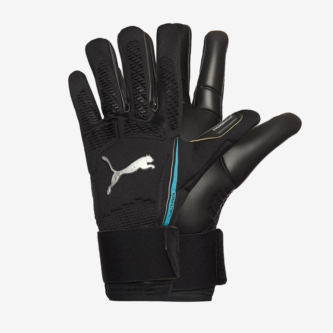Stay in the zone wearing PUMA Ultra Ultimate Hybrid goalkeeper gloves in Puma BlackBright Aqua, featuring an updated backhand made with breathable, flexible fabric. Designed to minimise distractions on the pitch, the Ultras streamlined backhand pairs a lightweight textile body with precisely placed silicone grip elements. The new setup allows increased range of motion when you flex your hand, so punching and handling the ball feels natural and comfortable. Perforations in the fabric keep your hands fresh and your mind on the game. On the palm, PUMAs elitelevel Superior Grip latex excels in both wet and dry conditions, while the Hybrid editions combo of negative and rollfinger cuts gives you the ideal mix of a snug fit and maximised ball contact. Ultra range endorsed by Jordan Pickford and Ellie Roebuck Palm 4mm Superior Grip latex palm for grip in wet and dry conditions Cut Hybrid combination of negative and rollfinger BackhandBody Light and stretchy body material with perforations and silicone grip elements Wrist Closure Elasticated cuff with wrist strap Thumb wrap