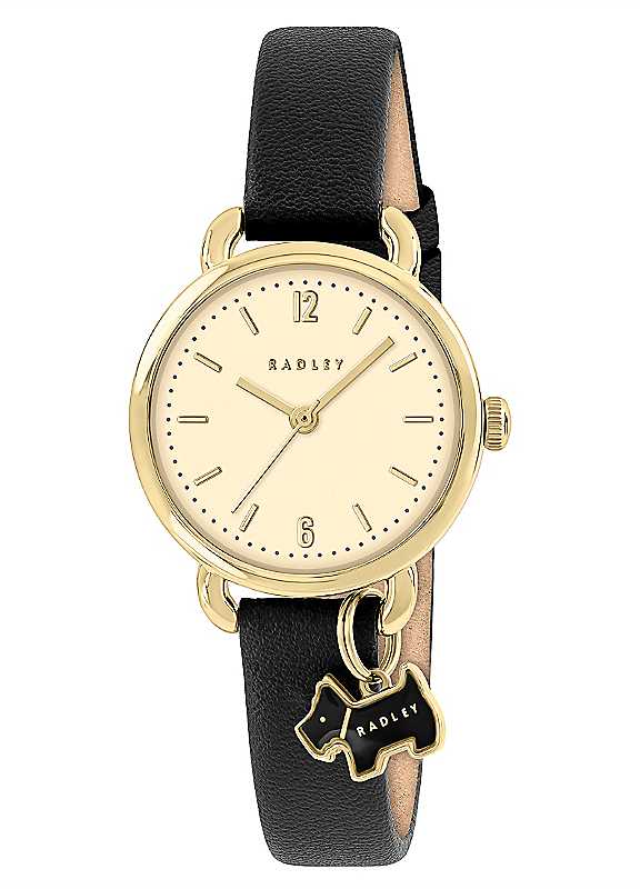 Radley London Bishops Lane Black Leather Strap Watch. Soft and rounded, Bishops Lane features a petite 26mm polished gold case with open shoulders. With subtle gold detailing and a warm champagne satin dial, this watch is beautifully finished with a black genuine leather strap and is fastened with a traditional polished gold buckle. Presented in a beautiful Radley London giftbox, with 2 year guarantee.Leather