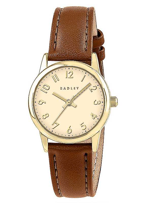 Radley Gold Plated Leather Strap Watch. This elegant watch features a polished pale gold round case, creating a warm and timeless look. The dial is finished in pale champagne satin and features full gold-tone numeral hour markers for clear, classic styling. Paired with a rich cognac leather strap, this design blends traditional charm with everyday elegance. Secured with a classic buckle fastening. Presented in a beautiful Radley London giftbox, with 2 year guarantee.Pale gold plated caseCognac leather strapPale champagne satin dialGold Plated