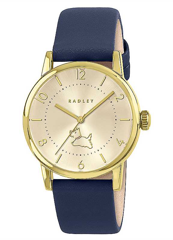 Radley London Spring Street Ink Leather Strap Watch. Spring Street features round 35mm case fitted with a domed lens for the ultimate clarity. The polished gold case surrounds a warm champagne sunray dial with fine gold detailing. The rich ink genuine leather strap adds a warm and sophisticated finish. Fastened with a traditional polished gold buckle. Presented in a beautiful Radley London giftbox, with 2 year guarantee.Leather