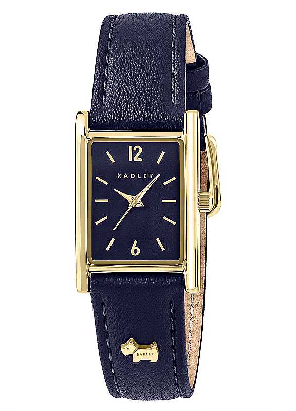 Radley Gold Plated Leather Strap Watch. This elegant watch features a sleek rectangular tank-style case in polished pale gold plating, bringing a timeless charm to the design. The dial is finished in rich ink navy satin, offering a smooth, sophisticated contrast to the warm gold tones. A matching ink navy leather strap adds a refined touch and is finished with the signature Radley dog charm stud for a playful detail. Secured with a classic buckle fastening for all-day comfort. Presented in a beautiful Radley London giftbox, with 2 year guarantee.Pale gold plated rectangular tank style caseInk navy leather strapRich ink navy satin dialGold Plated