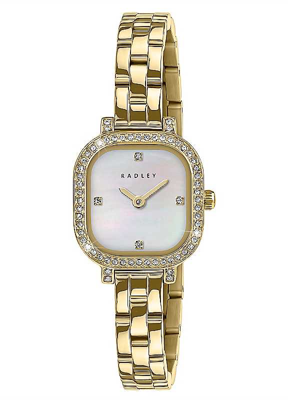 Radley Gold Plated Bracelet Watch. This elegant watch features a softly rounded square case in polished pale gold plating. The dial showcases a stunning freshwater mother of pearl finish with a subtle rainbow effect, creating a luminous backdrop that shifts beautifully in the light while a clear stone-set bezel adds a touch of refined sparkle. The slim, tapered H-link bracelet in matching gold plating secures with a sleek jewellery clasp. Presented in a beautiful Radley London giftbox, with 2 year guarantee.Pale gold plated case with stone set bezelTapered H-link braceletFreshwater mother of pearl dialGold Plated