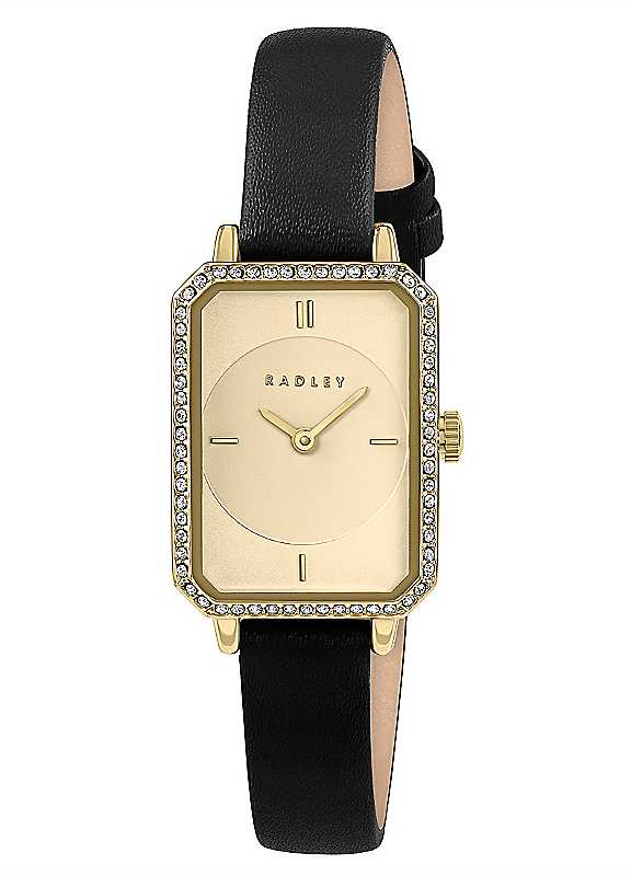 Radley Gold Plated Leather Strap Watch. This elegant watch features a sleek rectangular case in polished pale gold plating, framed by a sparkling clear stone-set bezel for a touch of refined glamour. The dial is finished in a pale champagne satin with a beautifully textured debossed centre, adding depth and sophistication. Finished with a smooth black leather strap and a classic buckle fastening for comfortable everyday wear. Presented in a beautiful Radley London giftbox, with 2 year guarantee.Pale gold plated stone set rectangular caseBlack leather strapPale champagne satin dialGold Plated