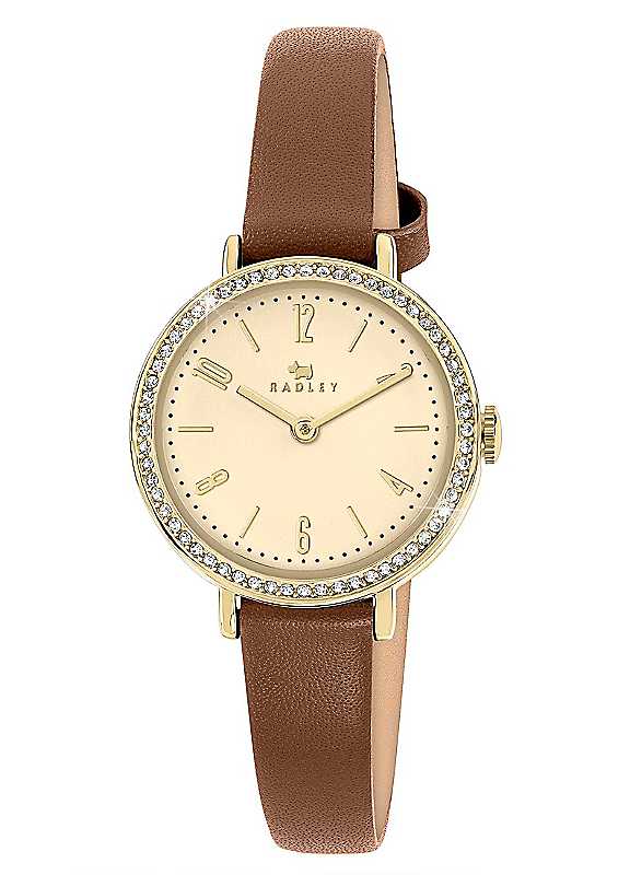 Radley London Windsor Lane Stone Set Cognac Leather Strap Watch. Featuring a 26mm Czech stoneset case which showcases a soft champagne satin dial. The watch is finished with a soft Cognac genuine leather strap and fastened with polished gold buckle. Presented in a beautiful Radley London giftbox, with 2 year guarantee.Leather
